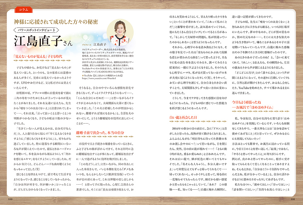 困ったときや悩んだときにパワースポットへ行くと、気分がすっきりしたり、悩みが解消されたり、不思議と困りごとの解決の糸口が見えてきます。本書では、そんな「訪れるだけで心が整う場所」「写真を眺めるだけでも気分が変わる場所」を、私の実体験と共にお届けしています。もし今、ちょっと疲れていたり、次の一歩に迷っていたりする方がいたら、本書がそっと背中を押すような存在になれたらうれしいです。