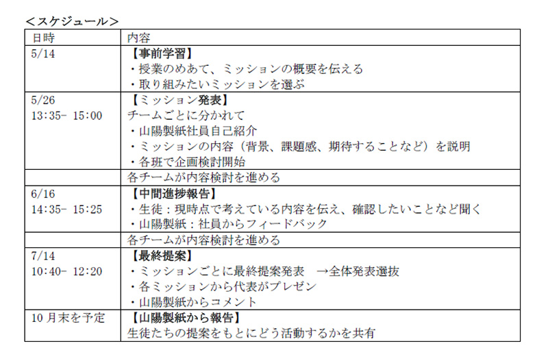 創業昭和3年、紙再生サービスメーカーの山陽製紙株式会社(所在地:大阪府泉南市 代表取締役:原田六次郎)と、NPO法人JAE、地元学校が共同で実施している出前授業型キャリア教育プログラム「ドリカムスクール」が10周年を迎え、今年は初めて中学校で開催します。1年生127人が7つのミッション解決に向けてグループワークに取り組み、7月14日にプレゼンテーションを行います。地域の子どもたちと当社社員双方の成長を目指して2016年に地元小学校でスタートし、延べ707人の子どもたちが参加しています。