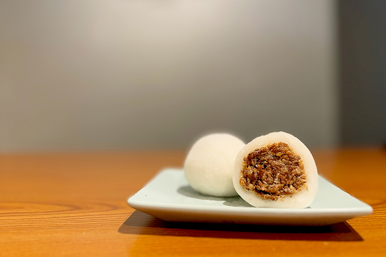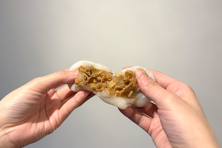 もちもちのお餅の中に、特製の肉餡をたっぷり包み込みました。
