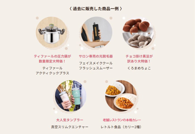 食品や飲料、日用品、アパレルから、美容・健康、家電製品まで、幅広いジャンルの「掘り出し物」を提供し、多くのユーザー様にご利用いただいています。