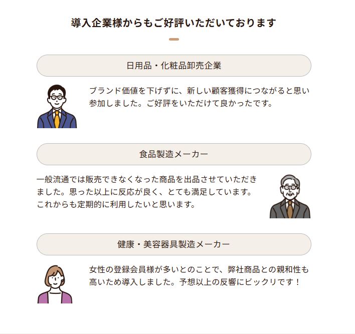 - 「ブランド価値を下げずに、新しい顧客獲得につながると思い参加しました。ご好評をいただけて良かったです。」(日用品・化粧品卸売企業)
