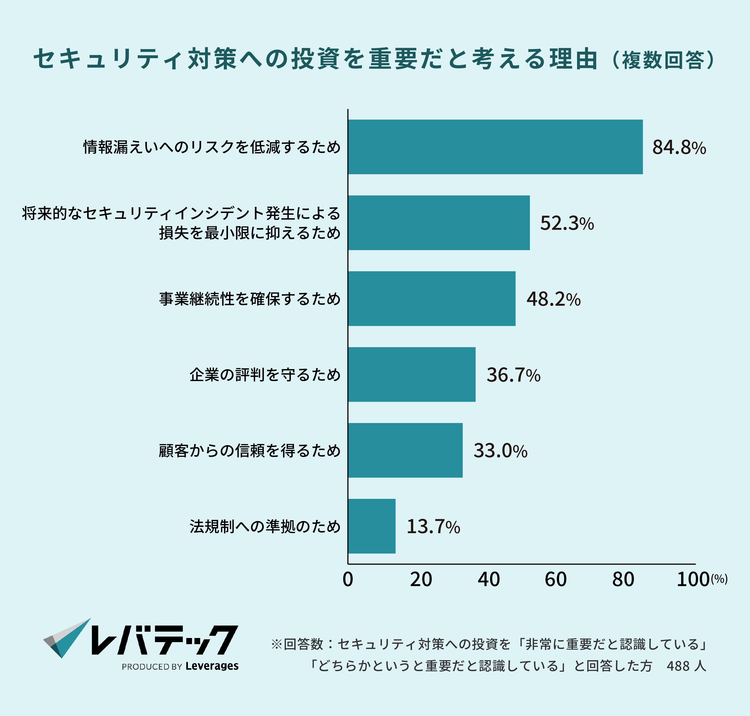 所属企業におけるセキュリティ対策への投資については、サイバー攻撃を受けた経験の有無にかかわらず約9割以上の情報システム担当者・経営層が「重要だと認識している」と回答しました。理由として「情報漏えいへのリスクを低減するため(84.8%)」が最も多く、「将来的なセキュリティインシデント発生による損失を最小限に抑えるため(52.3%)」「事業継続性を確保するため(48.2%)」が続きます。