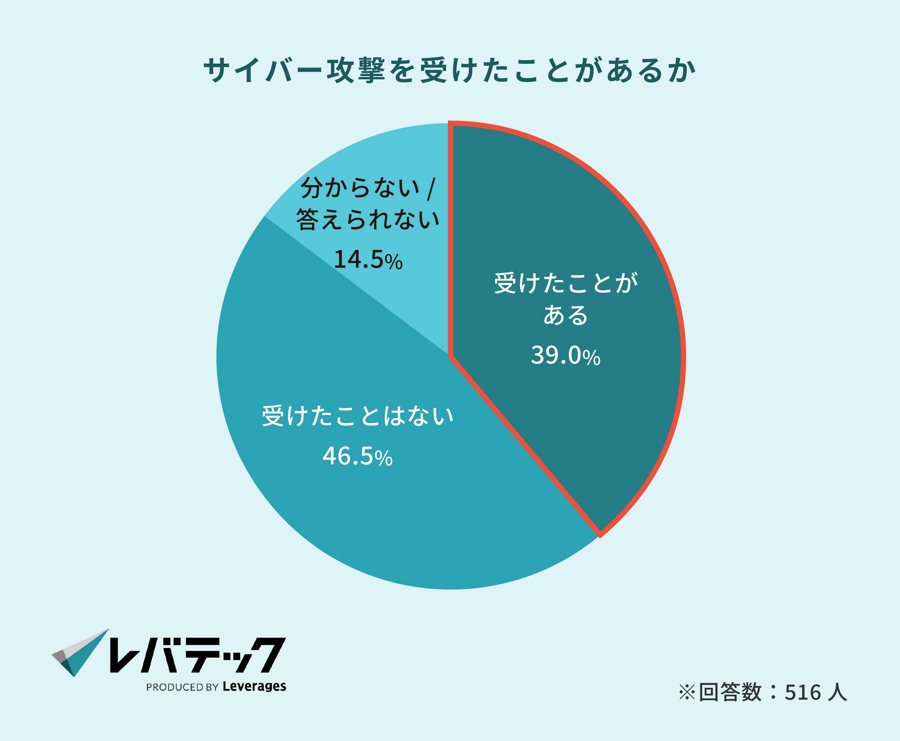 情報システム部門の担当者と経営層516名に対し「実際にサイバー攻撃を受けたことがあるか」と聞いたところ、約4割が「受けたことがある(39.0%)」と回答しました。