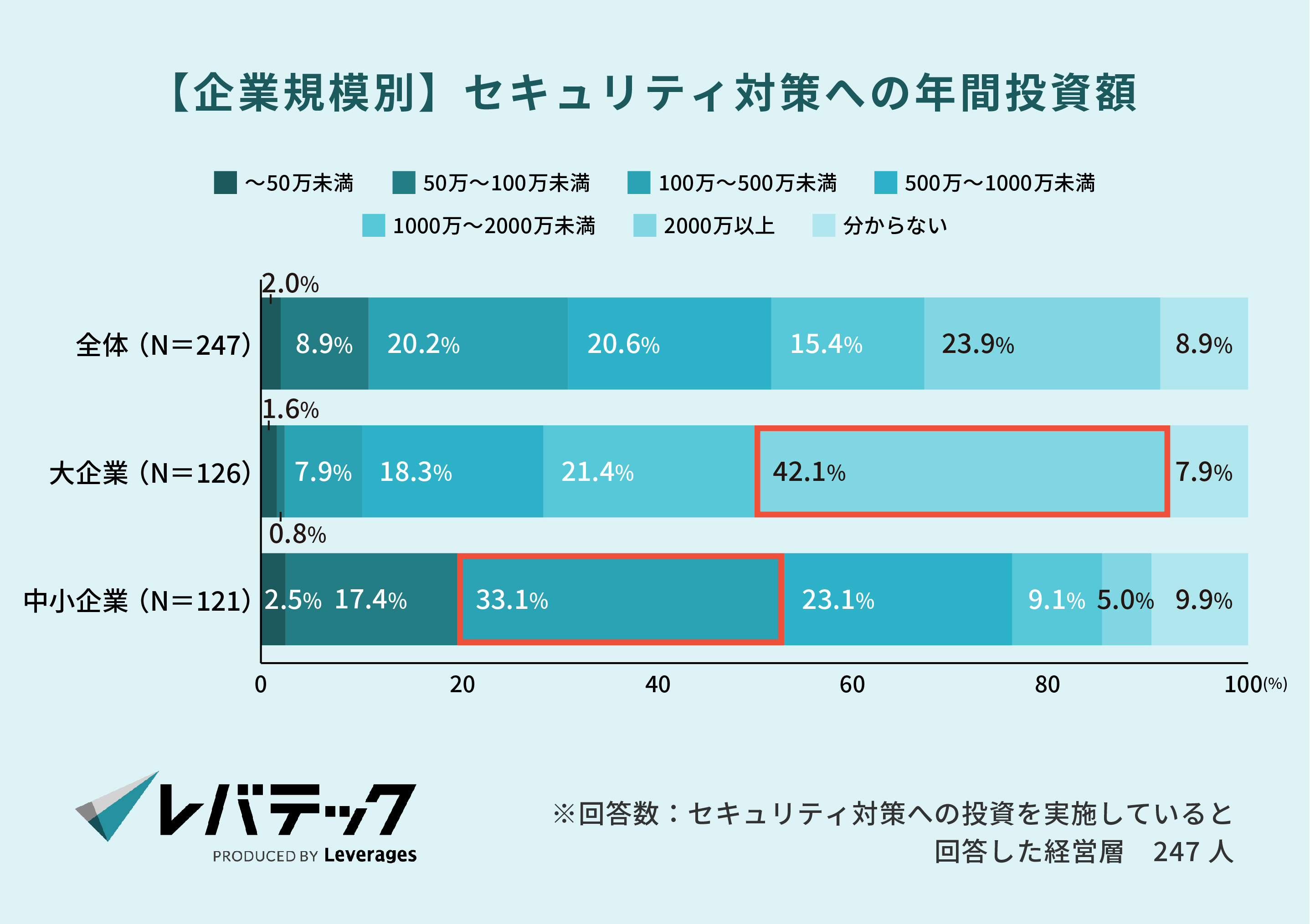 一方で、セキュリティ対策への投資について「十分に実施できている(20.5%)」と回答した経営層は2割に留まりました。企業規模別では、一般的に大企業と定義される従業員数1,000人以上の企業においては「十分に実施できている」と回答した割合が27.1%となり、1,000人未満の企業と比較して13.1pt高いことがわかります。