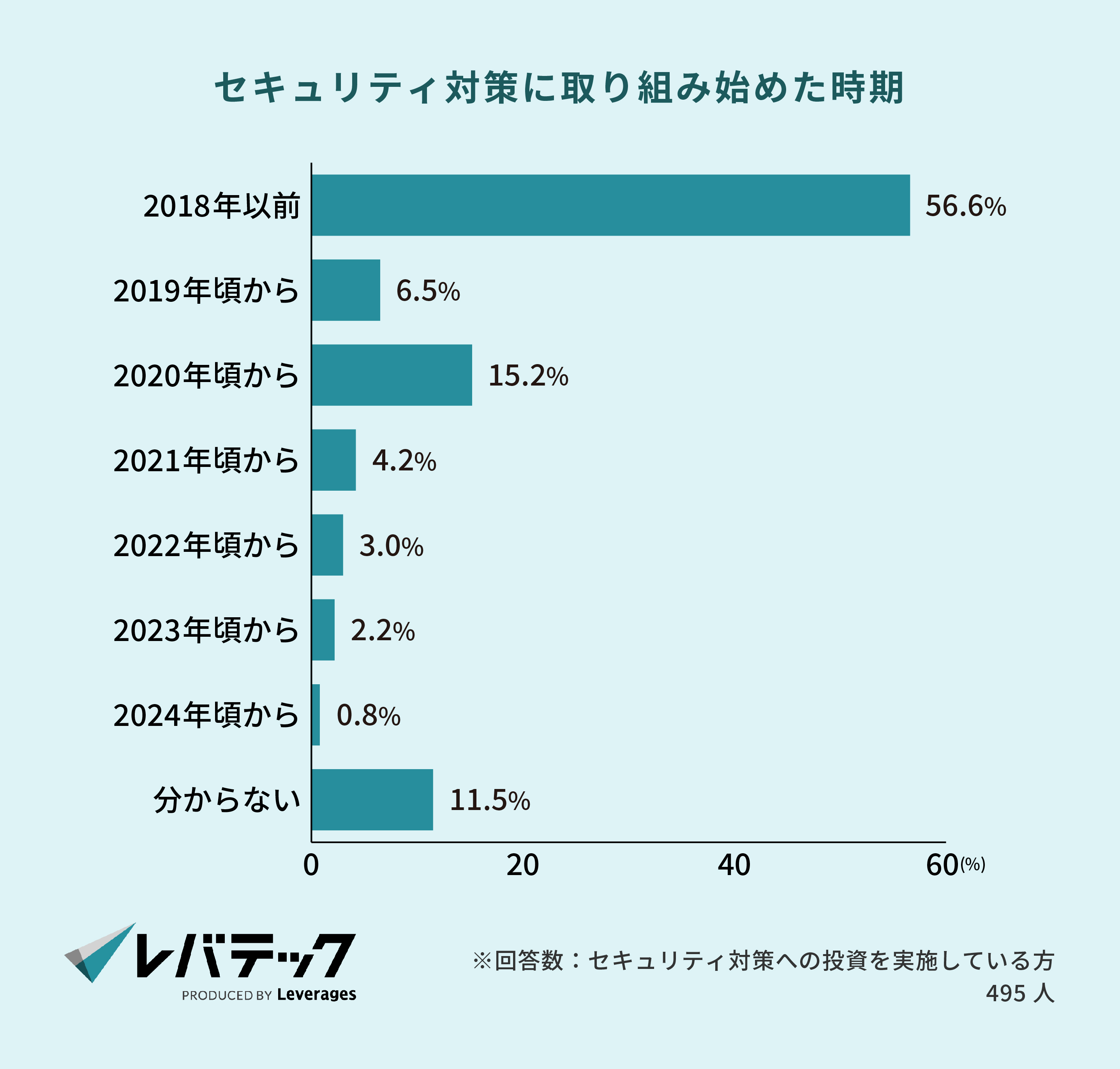 セキュリティ対策に取り組み始めた時期は「2018年以前(56.6%)」が過半数を超えました。一方、約25%は2020年以降に開始しており、なかでも「2020年頃から(15.2%)」に集中していることから、コロナ禍でリモートワークが普及したことをきっかけにセキュリティ対策を導入した企業も一定数存在するのではないでしょうか。