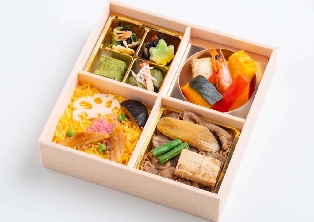 老舗料亭「たん熊北店」が手がける甘辛すき焼きごはんと、彩り豊かなちらし寿司の二段構えに、繊細な副菜やデザートを添えた、見た目も味も上品なおもてなし弁当。素材の持ち味を丁寧に引き出した一折です。