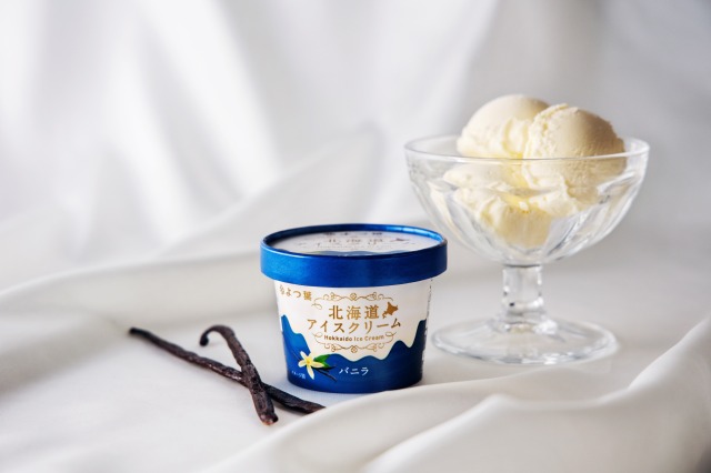 乳原料は北海道産を100%使用した、素材本来のおいしさを大切にしたバニラアイスで、ミルクのコクと華やかなバニラの香りが重なり合う、贅沢な濃厚さが魅力です。安定剤・乳化剤・着色料は使用しておらず、ほっこりやさしい後味をお楽しみください。