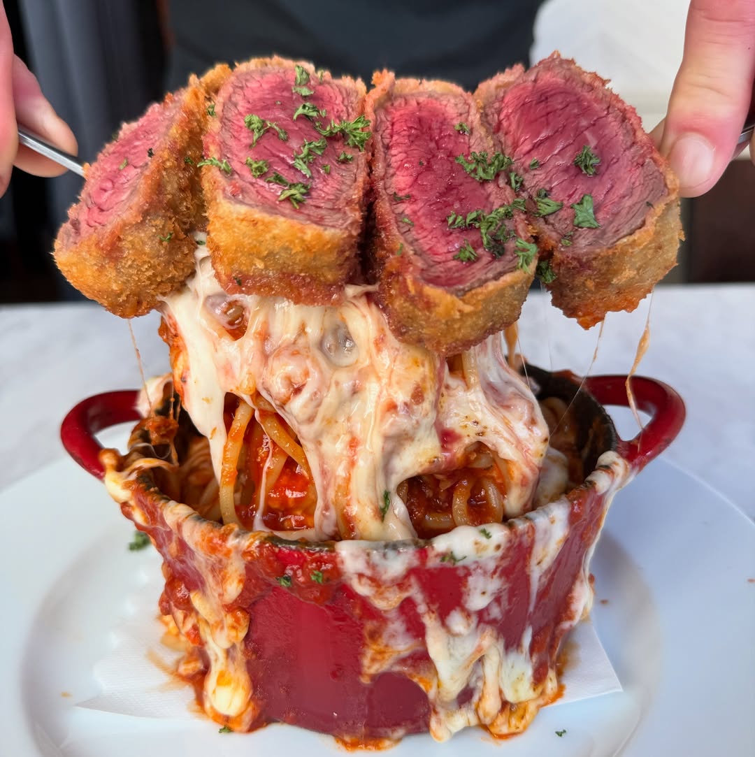 “レアカツ×チーズ×濃厚ミートソース”という素材の重なりを、ビジュアルと温度のコントラストで魅せる『牛レアカツのボルケーノパスタ』は、味わいだけでなく「映える美しさ」も兼ね備えた、今季注目の一皿です。
