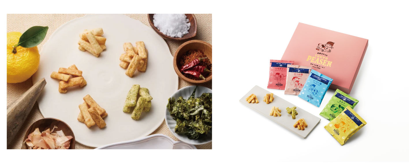 今なお発売当時からのこだわりの製法で作り続けられるピーセンは、サクッと軽やかでピーナッツが香ばしい、唯一無二の美味しさです。東京ピーセンと相性のよい味付鰹節粉末を使用し、かつお節の豊かなうま味を楽しめる味わいとなっております。