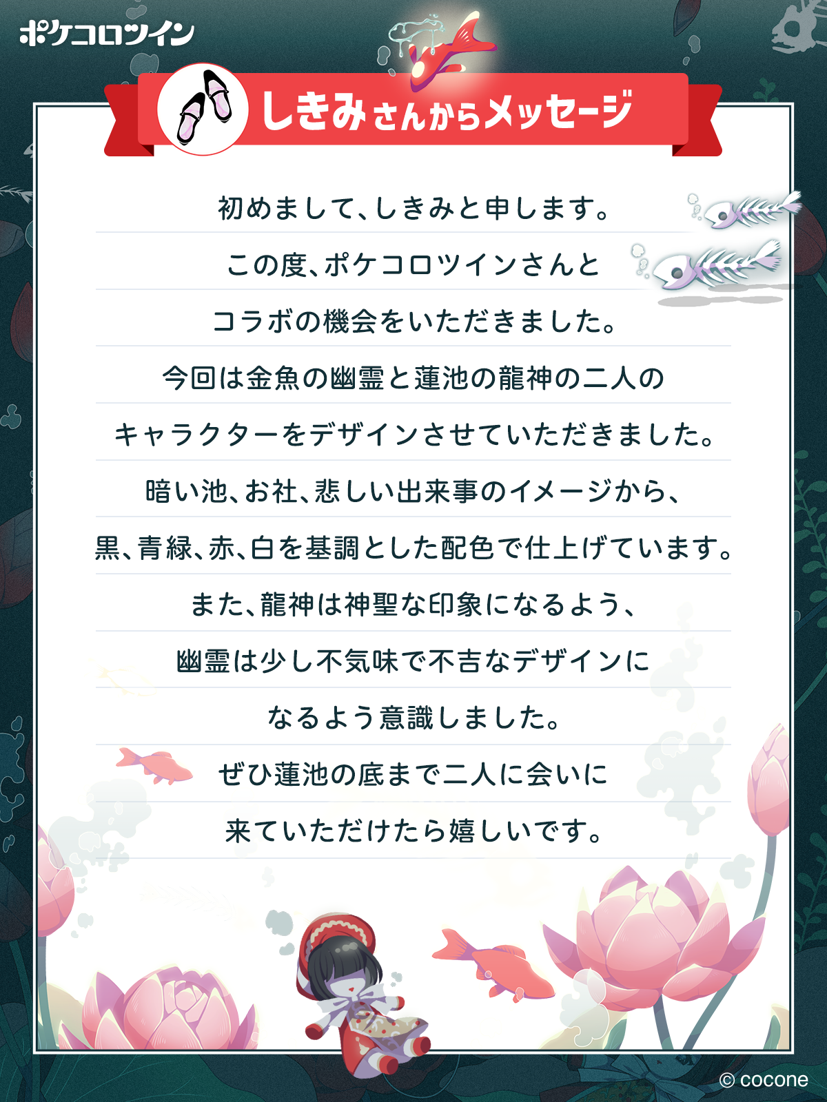 しきみさんの描き下ろしイラストを元にしたアバターファッションアイテムだけでなく、イラストの世界観をより楽しめるよう、テーマに合わせた「ココリウム」のアイテムも期間限定ガチャから入手することができます。また、しきみさん直筆サイン色紙や描き下ろしイラストを使用したオリジナルグッズが当たる記念キャンペーンなども実施。『ポケコロツイン』のお客様だけでなく、しきみさんのファンの方も楽しめる企画をご用意しています。