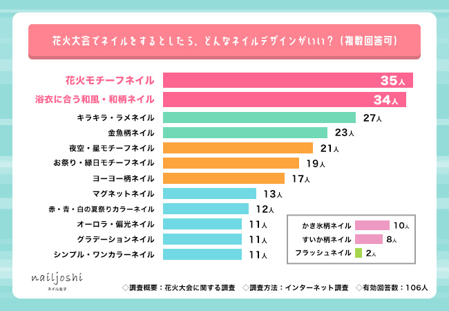 - 花火大会でしたいネイルデザイン1位は『花火モチーフネイル』(35人)、2位『浴衣に合う和風・和柄ネイル』(34人)、3位『キラキラ・ラメネイル』(27人)