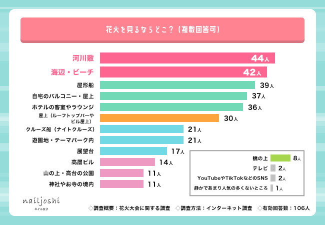 - 花火大会を見たい場所1位は『河川敷』(44人)、2位『海辺・ビーチ』(42人)、3位『屋形船』(39人)