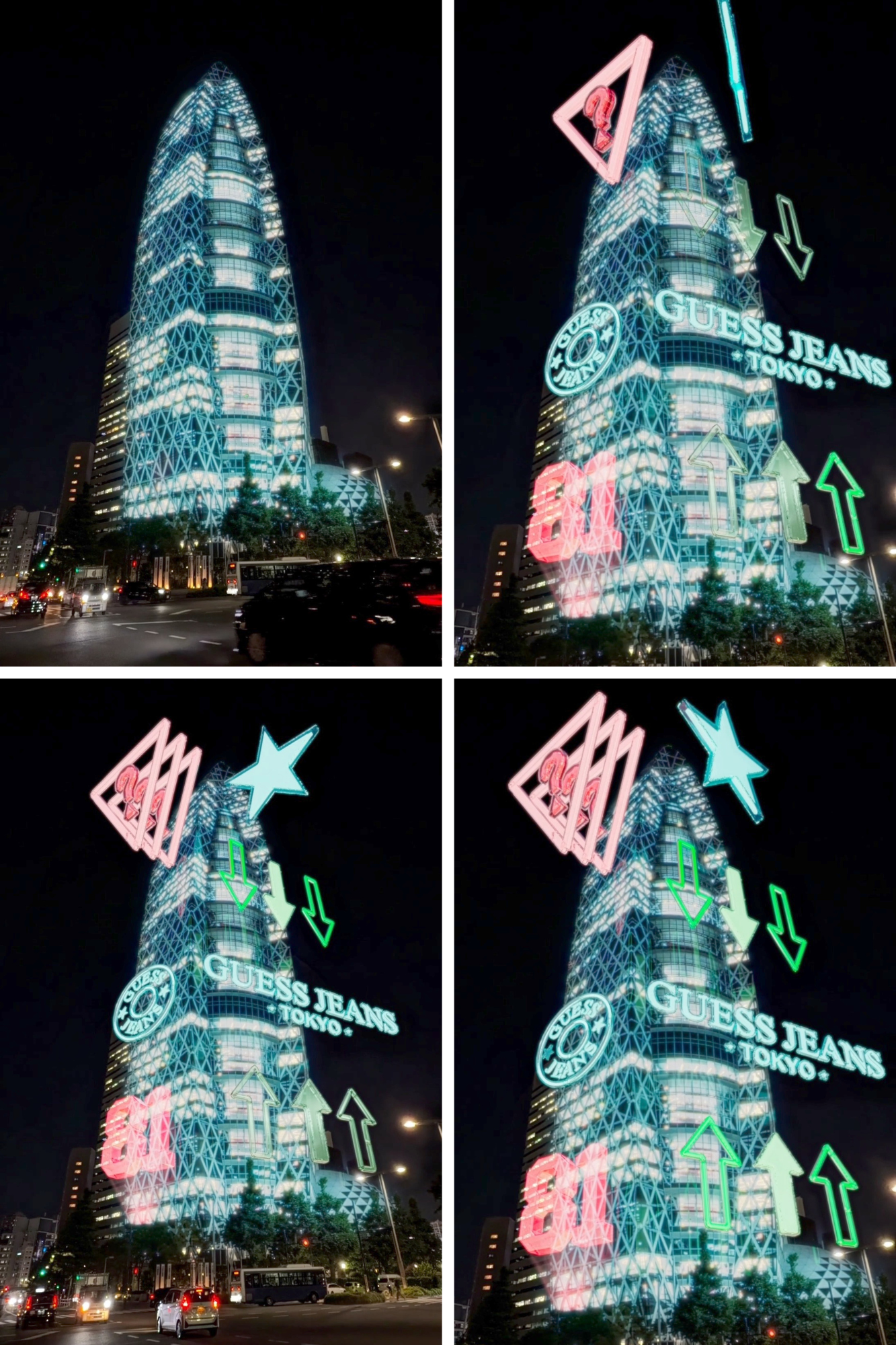 本取り組みは、ファッション・デザイン・美容分野のプロを育成する専門学校「モード学園」と、「国際ファッション専門職大学」の学生が通うコクーンタワーを舞台に、GUESS JEANSのブランドビジュアルをCGIで表現。夜のタワーにGUESS JEANSのロゴやアイコンがネオンのように浮かび上がる演出を、SNS向け縦型動画として展開しました。