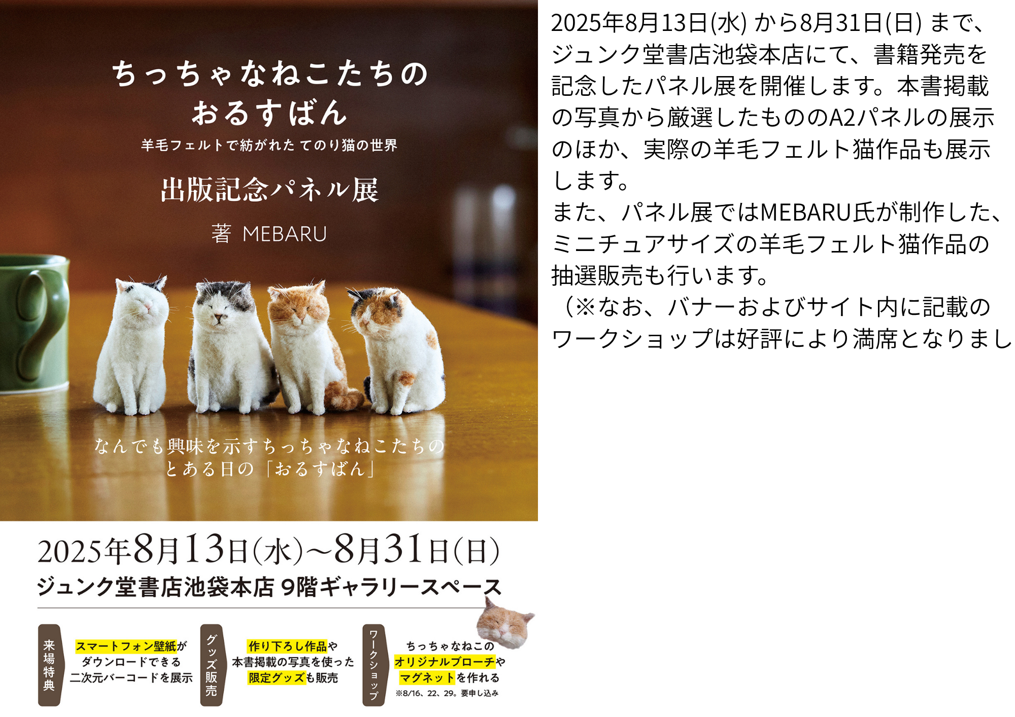 2025年8月13日(水)から8月31日(日)まで、ジュンク堂書店池袋本店にて『ちっちゃなねこたちのおるすばん』出版記念パネル展開催!