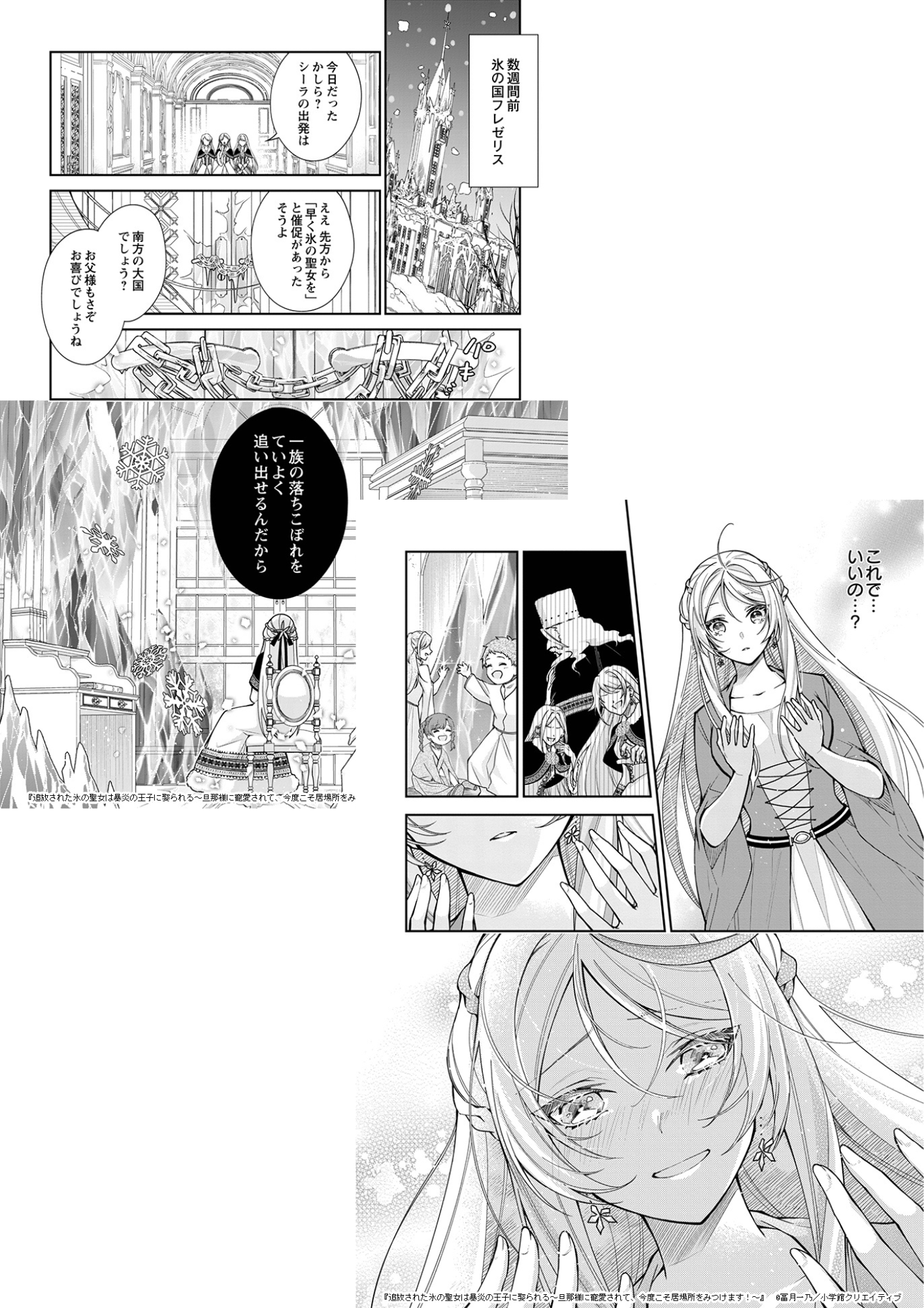 「俺には君の力が必要だ。悪いが手放す気はない――」 辺境の雪国・フレゼリス。王族末姫のシーラは、強大すぎる氷の魔力を制御しきれず、《氷の聖女》とは名ばかりの落ちこぼれとして、王宮の皆に蔑まれていた。そんなシーラに、熱砂の国・アブハジクのイサーク王子から求婚が届く。イサークは《炎の悪魔》と呼ばれ、他国にまで悪名とどろく存在。そんな彼の妻にと指名されたシーラは、厄介払いかのように母国を追われ、嫁がされてしまうのだった。 しかし、誰の手にも負えないはずのイサークの“暴炎”は、シーラの氷のキスでコントロールできるとわかり……!? ――強すぎる魔力のせいで、厄介者あつかいされてきた私たち。 だけどふたりの力を合わせることで、新しい人生が始まるんだ――…! 政略結婚から始まる、じれキュン溺愛ラブストーリー!新婚夫婦らしい一幕をえがいた限定描きおろしエピソード12Pのほか、貴重なキャラクター設定画、描きおろしカット等、特典を多数収録!