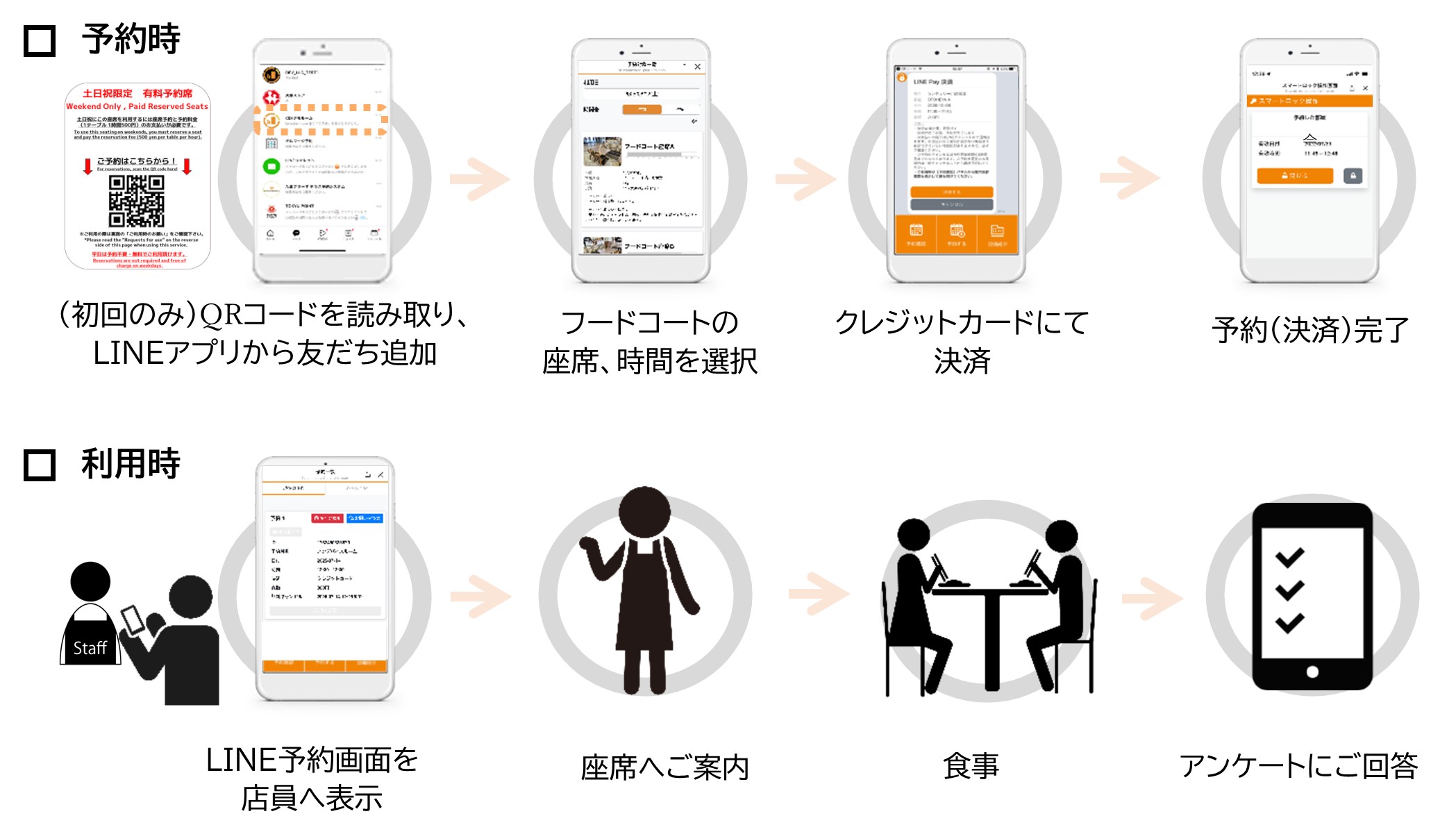 本システムでは、事前に座席の予約が可能で、お客様は混雑時でもスムーズにお食事を楽しみいただけます。また、県外から来場されるお客様も多く、待ち時間を縮小することで、時間を有効に活用でき、アウトレットでのショッピングをより快適に、充実したものにしていただけます。