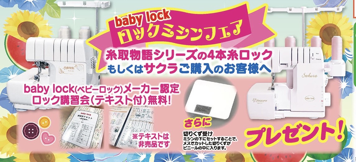 福岡県北九州市のミシン専門店「ミシン生活」では、baby lock(ベビーロック)の人気ロックミシン「糸取物語シリーズの4本糸ロックミシン」または「Sakura(サクラ)」をご購入いただいたお客様を対象に、2025年8月末までの期間限定キャンペーンを開催中です!