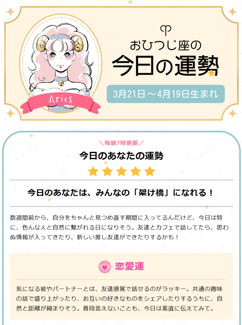 毎朝7時に更新される運勢をチェックすることで、あなたの1日がより前向きにスタートできるよう、そっと背中を押せる存在を目指しています。