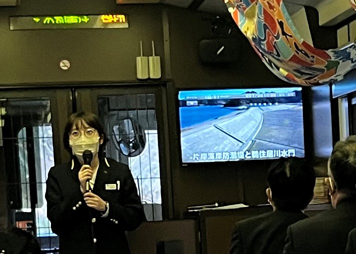 これまでガイドが写真パネルを持ちながら説明を行っていましたが、今回、車両の前後にモニターを設置したことで、説明内容に関わる写真などをどの席からも同じようにご覧いただけます。