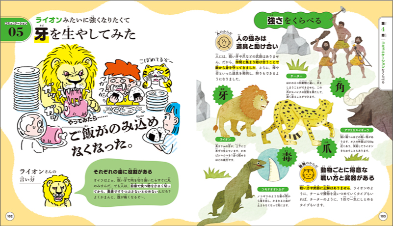 主人公の二人と一緒に、いろんな動物に変身するなど「やってみたら...どうなった⁉」を体験。生き物と人間の体や心の役割や仕組み、行動、意識、老後などをくらべてみます。全ページイラスト解説付き。