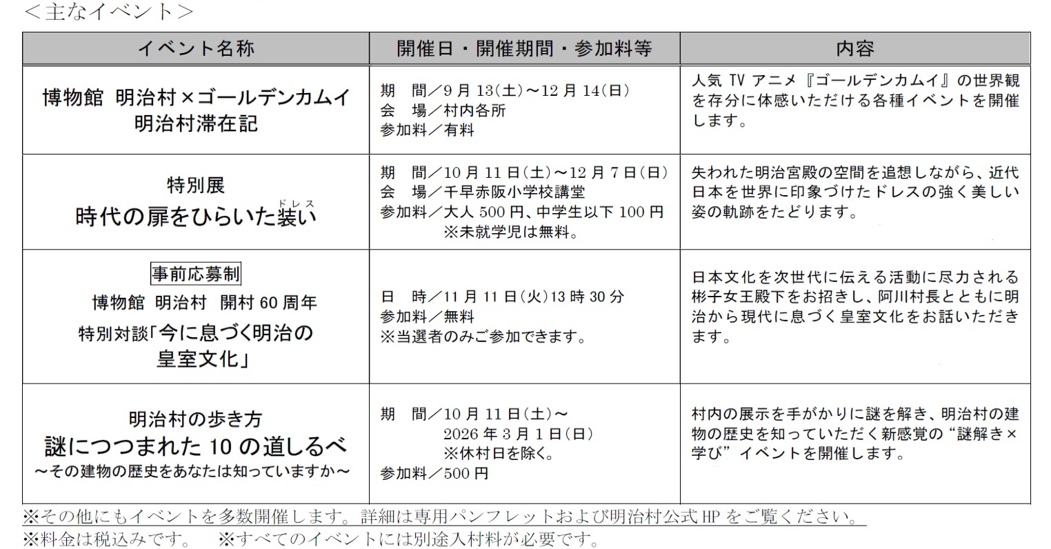 博物館 明治村(犬山市内山1番地、理事長:髙﨑 裕樹)では、9月13日(土)~12月14日(日)までの期間、秋催事として、人気TVアニメ『ゴールデンカムイ』(以下、『ゴールデンカムイ』)とのコラボイベント「博物館 明治村 × ゴールデンカムイ 明治村滞在記」をはじめ、各種イベントを開催します。