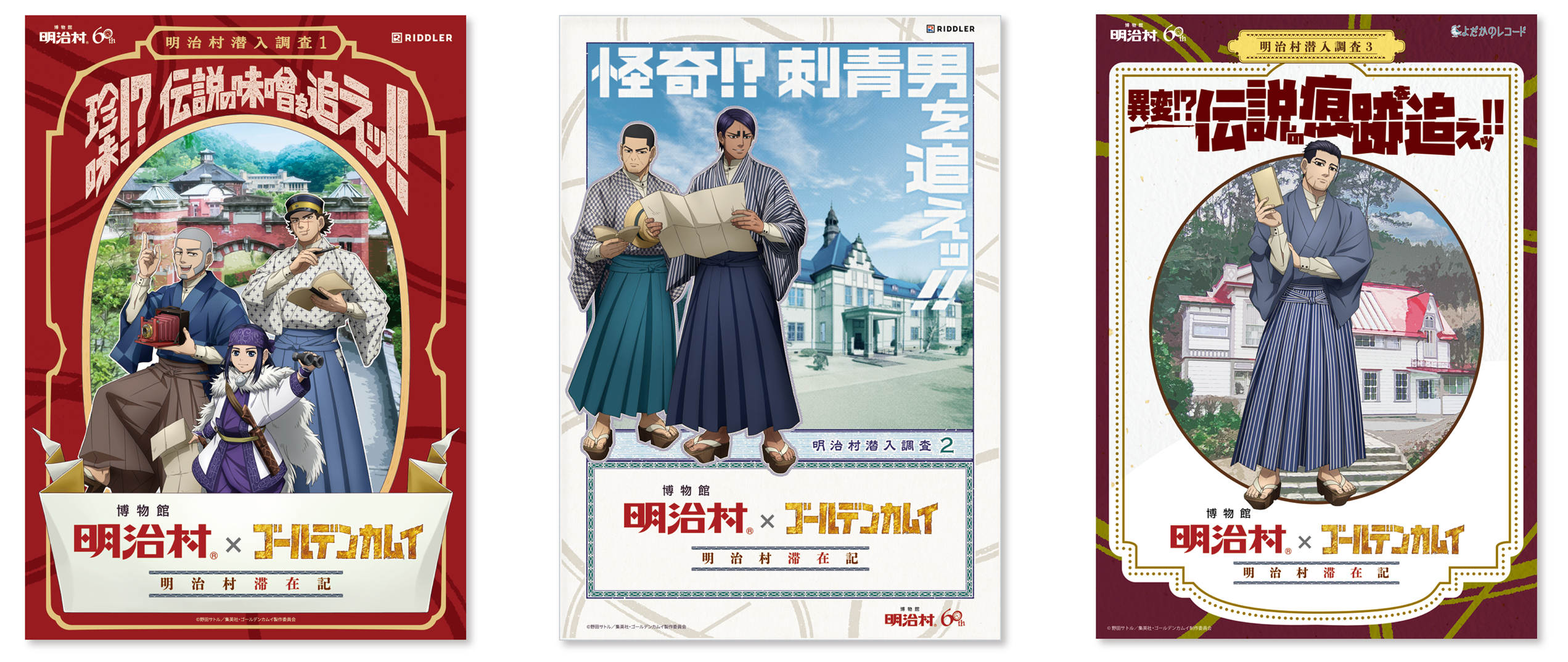 ○内容/明治村に伝わる「とある伝説」を『ゴールデンカムイ』のキャラクターたちと一緒に潜入調査して解き明かします。ストーリーは本イベント限定のオリジナルで、コースは難易度別に3種類をご用意します。各コースをクリアされた方には「オリジナルステッカー」を、すべてのコースをクリアされた方にはコンプリート賞として「オリジナルクリアファイル」をプレゼントします。