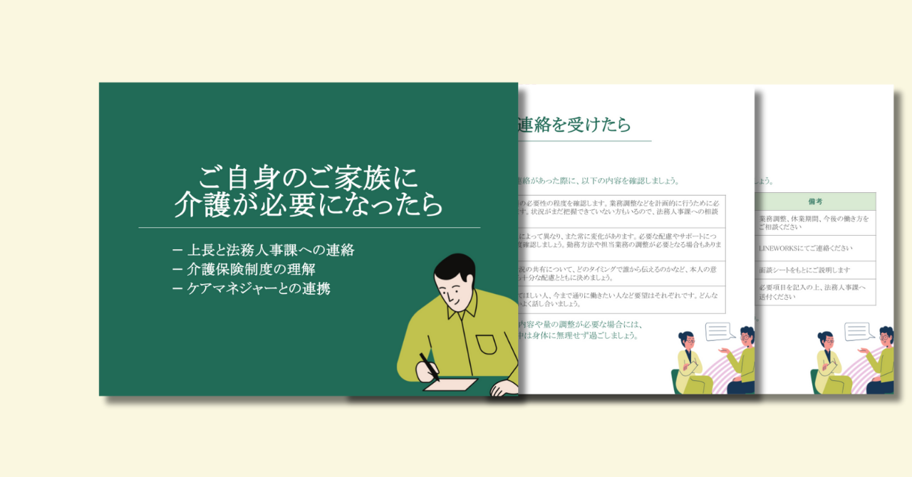 連絡タイミング、制度の申請フローなどが分かりやすく整理されており、初めて介護と向き合う社員にも安心して使っていただける構成となっています。