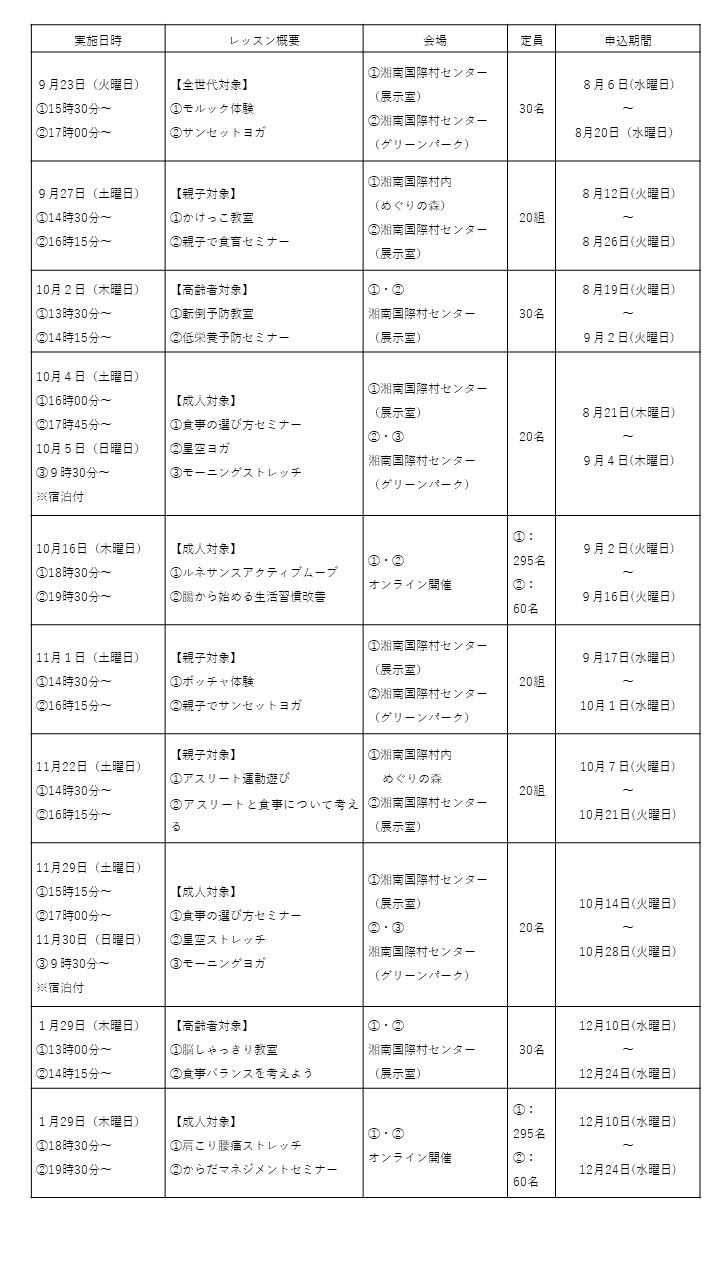 株式会社ルネサンス(本社:東京都墨田区、代表取締役社長執行役員:望月 美佐緒、以下「当社」)は、神奈川県の委託を受け、2025年9月23日(火・祝)から神奈川県横須賀市と三浦郡葉山町にまたがる湘南国際村の豊かな自然環境の中で、未病改善レッスンを開催します。
