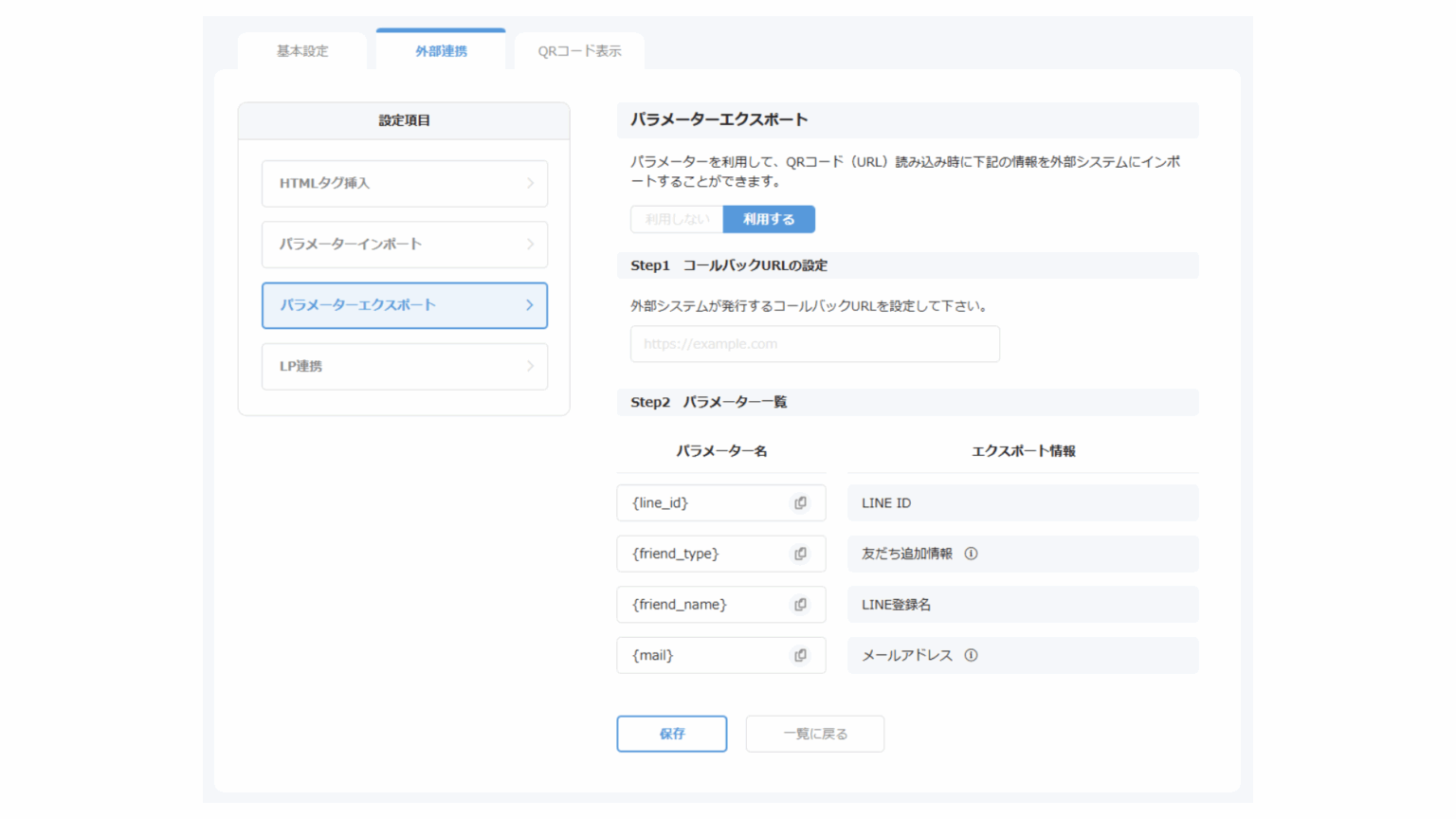 L Message(エルメ)に外部システムの「コールバックURL」(データ受け取り用のアドレス)を設定すると、お客さまが友だち追加をした際に、LINE IDや追加情報、LINE登録名、メールアドレスなどを自動で送信できます。
