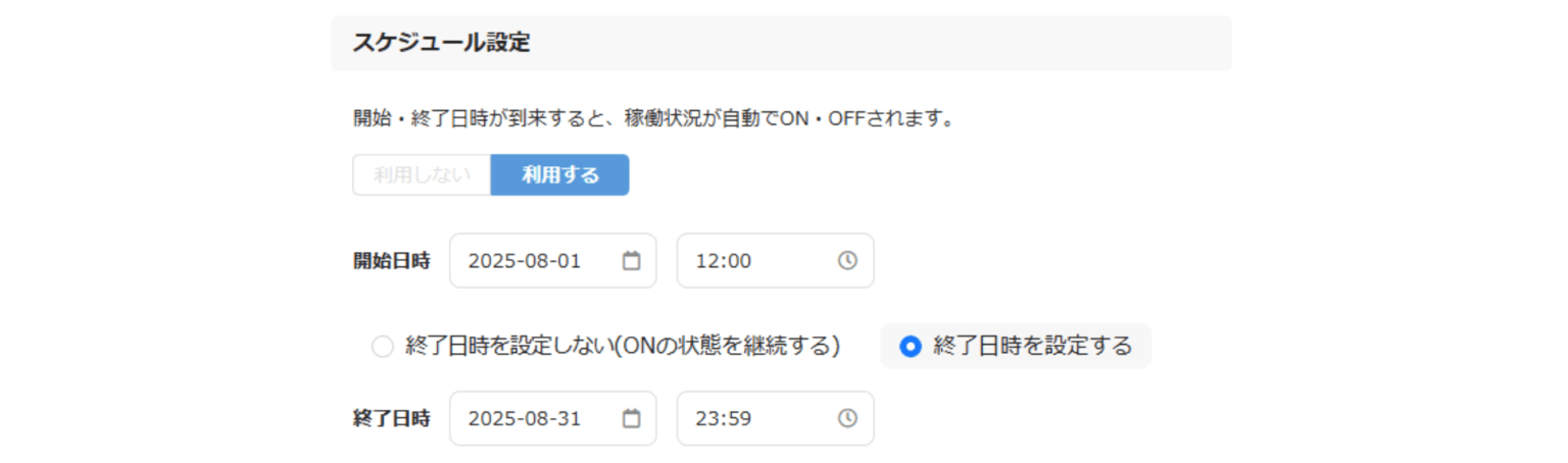 期間限定キャンペーンやイベント告知などで、手動で切り替える手間がなくなります。運用担当者の負担を減らし、確実な期間管理が可能です。