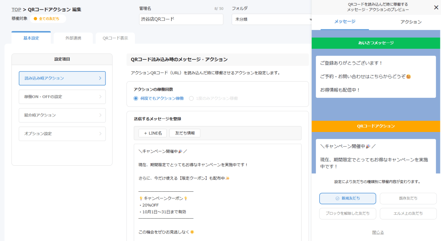 新たに追加された「稼働プレビュー」機能では、QRコードを読み取った友だちに対して送信されるメッセージ内容や実行されるアクションを、事前に確認できるようになりました。新規のお客さまか既存のお客さまかなど、タイプごとに確認が可能です。
