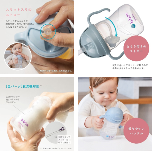 赤ちゃんが“自分で飲む”楽しさを味わえるように設計された「b.box」のストローマグ。 カップを傾けても中身がしっかり飲める「おもり付きストロー」が特長です。