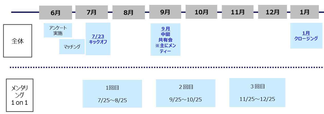 期間中は1on1を原則対面にて3回行い、中間共有会では、メンティー同士での学びの共有やロー ルモデル講演を予定しています。