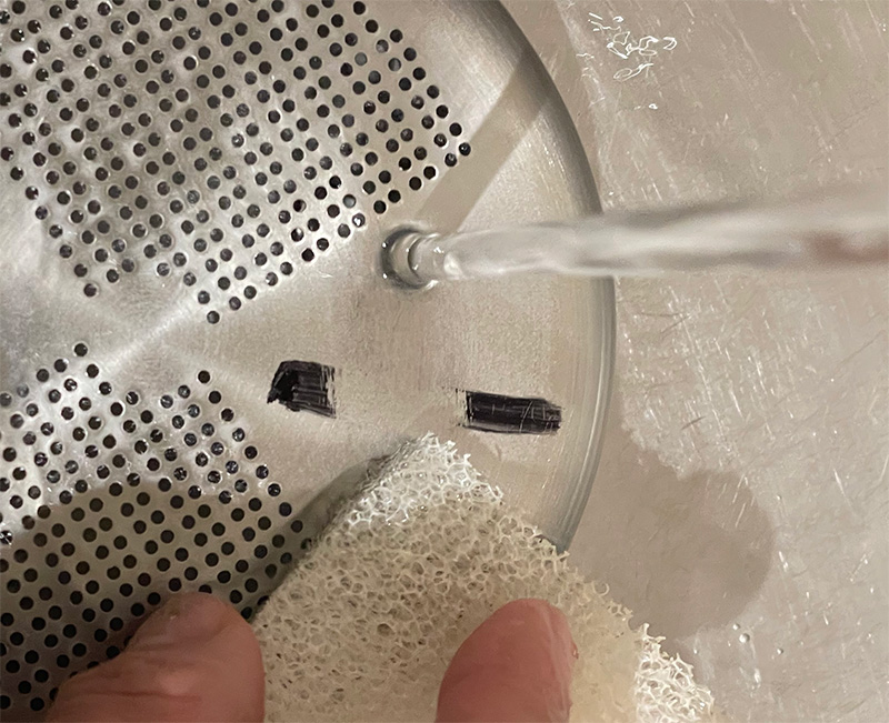 「IWANO 排水口 ゴミ受け」には、水との親和性に優れた特殊な塗料を塗った加工が施されています。特殊加工をした表面に水をかけると、親水性の効果で汚れの間に水が入り込みます。そして水で浮き上がった汚れは、そのまま水とともにキレイに流されるのです。この仕組みにより、水だけで油汚れを落とすことがができ、優れた防汚効果を発揮することができるのです。またこの特殊な塗料は100%無機塗料なので、地球にも優しい加工なのです。