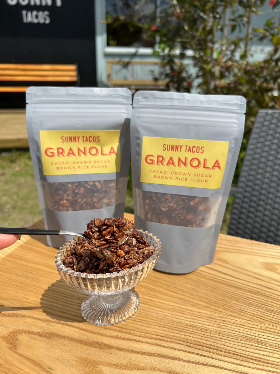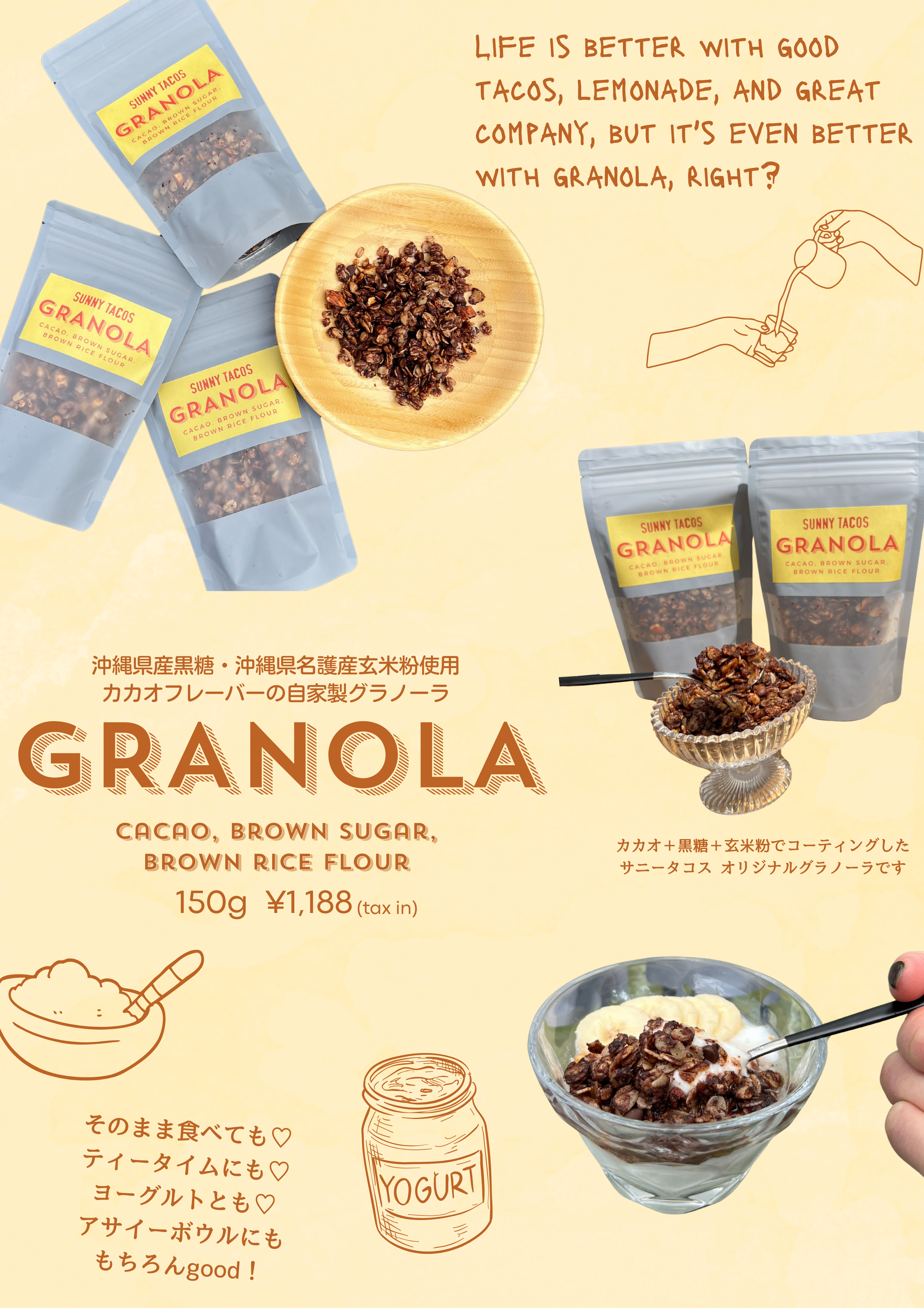 沖縄県産の黒糖、名護市のブラント米「羽地米」の玄米粉、そして厳選したカカオをコーティングして焼き上げたオリジナルの味わいで「グラノーラだけで販売して欲しい!」という声も多くいただいており、満を持して販売スタート!