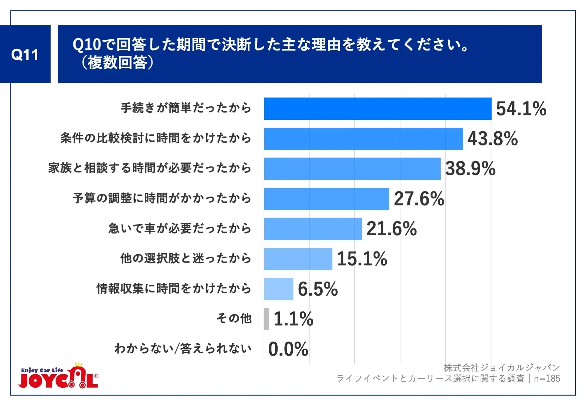 Q10で「契約前には発生しなかった」「わからない/答えられない」以外と回答した方に、「Q11.Q10で回答した期間で決断した主な理由を教えてください。(複数回答)」(n=185)と質問したところ、「手続きが簡単だったから」が54.1%、「条件の比較検討に時間をかけたから」が43.8%という回答となりました。
