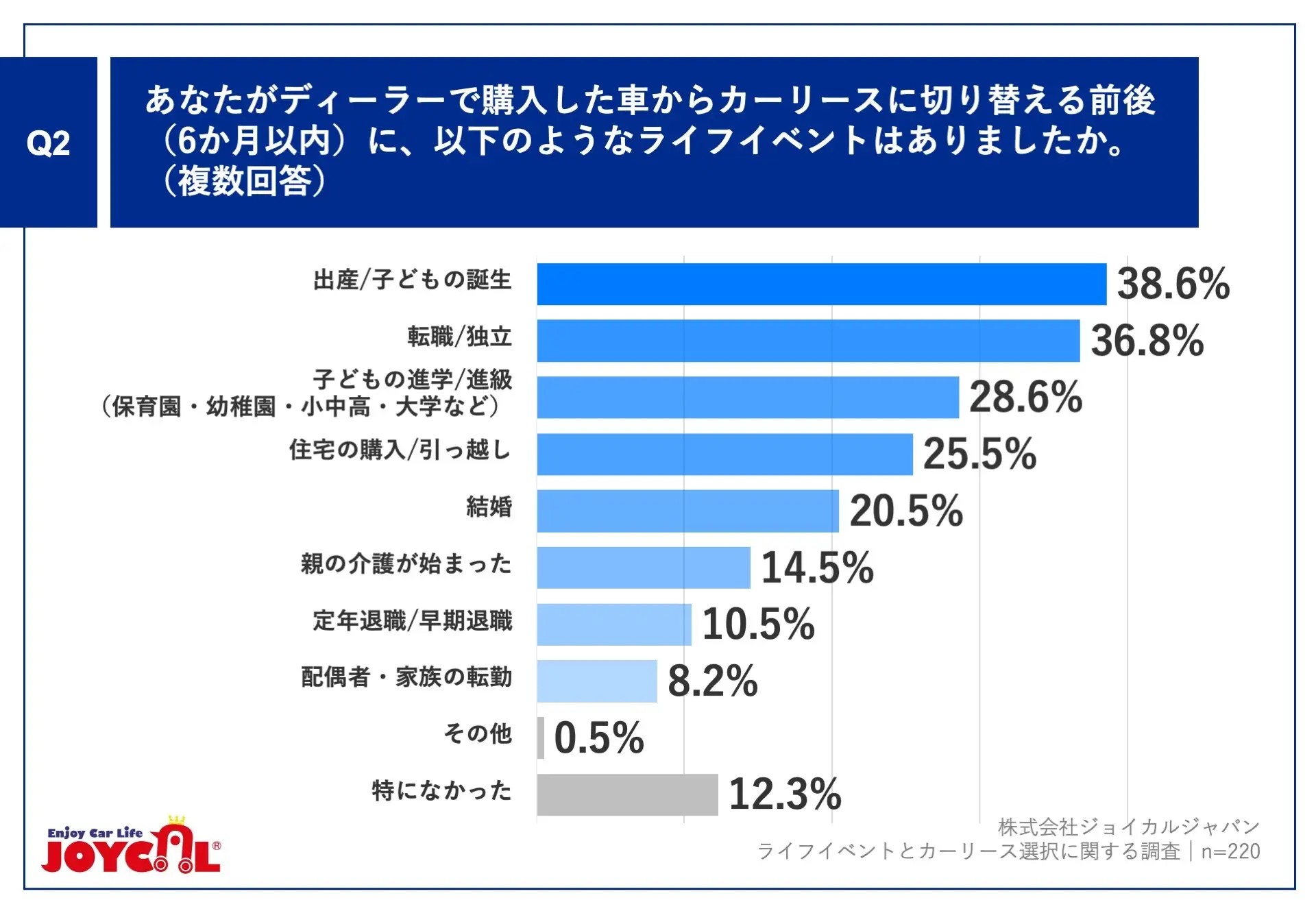 「Q2.あなたがディーラーで購入した車からカーリースに切り替える前後(6か月以内)に、以下のようなライフイベントはありましたか。(複数回答)」(n=220)と質問したところ、「出産/子どもの誕生」が38.6%、「転職/独立」が36.8%、「子どもの進学/進級(保育園・幼稚園・小中高・大学など)」が28.6%という回答となりました。
