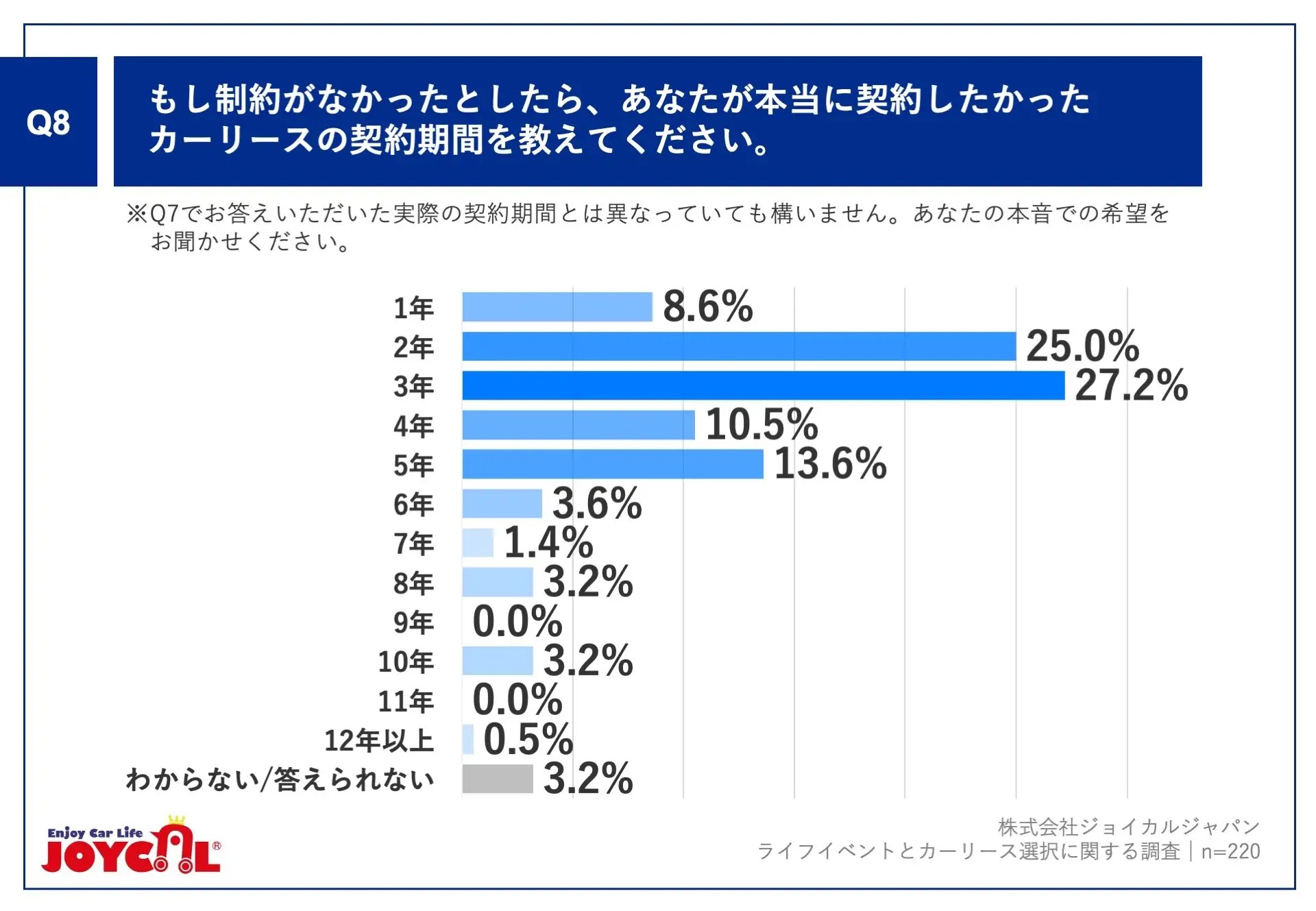「Q8.もし制約がなかったとしたら、あなたが本当に契約したかったカーリースの契約期間を教えてください。」(n=220)と質問したところ、「3年」が27.2%、「2年」が25.0%という回答となりました。