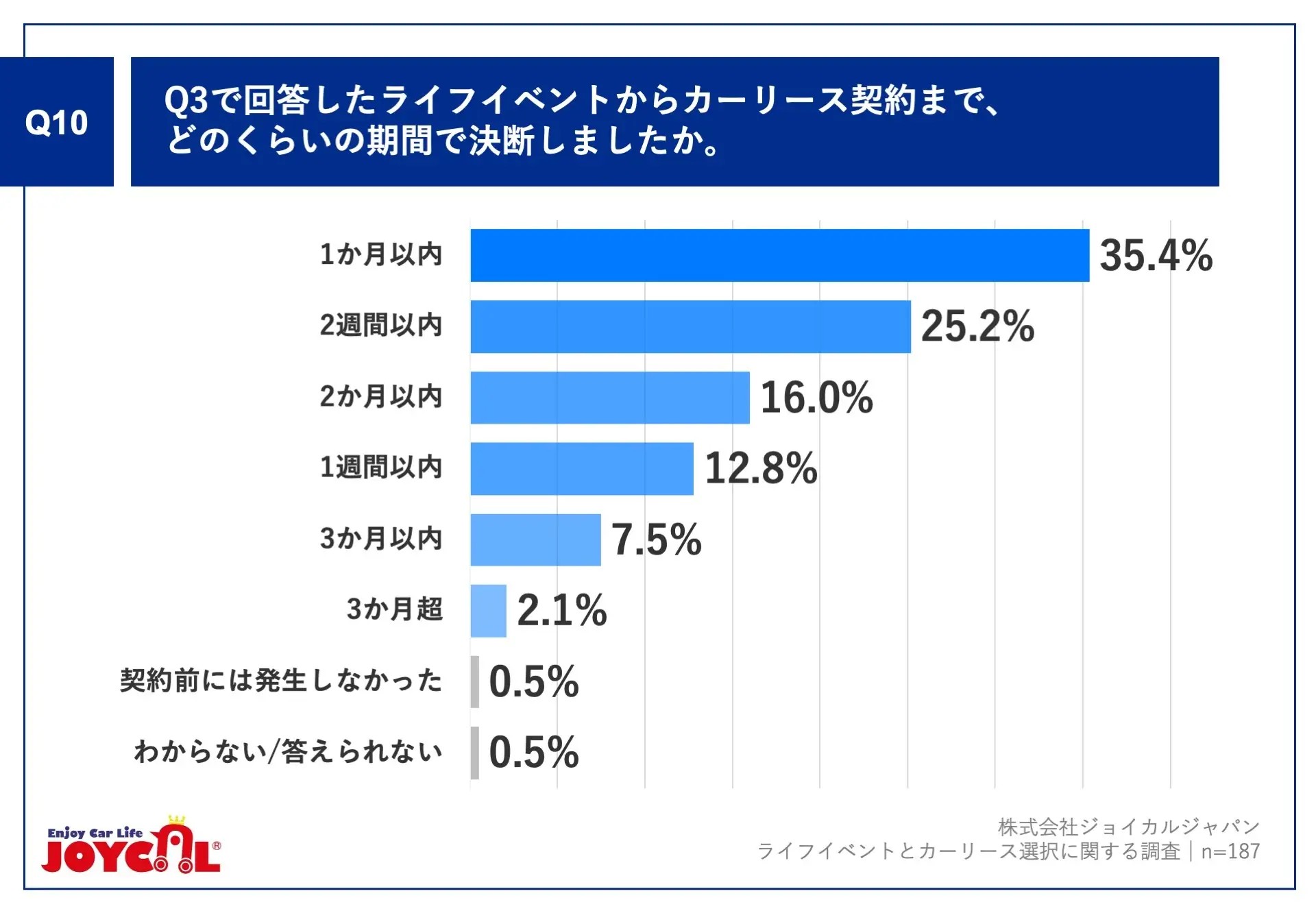Q3で「特になかった」以外を回答した方に、「Q10.Q3で回答したライフイベントからカーリース契約まで、どのくらいの期間で決断しましたか。」(n=187)と質問したところ、「1か月以内」が35.3%、「2週間以内」が25.1%、「2か月以内」が16.0.0%という回答となりました。
