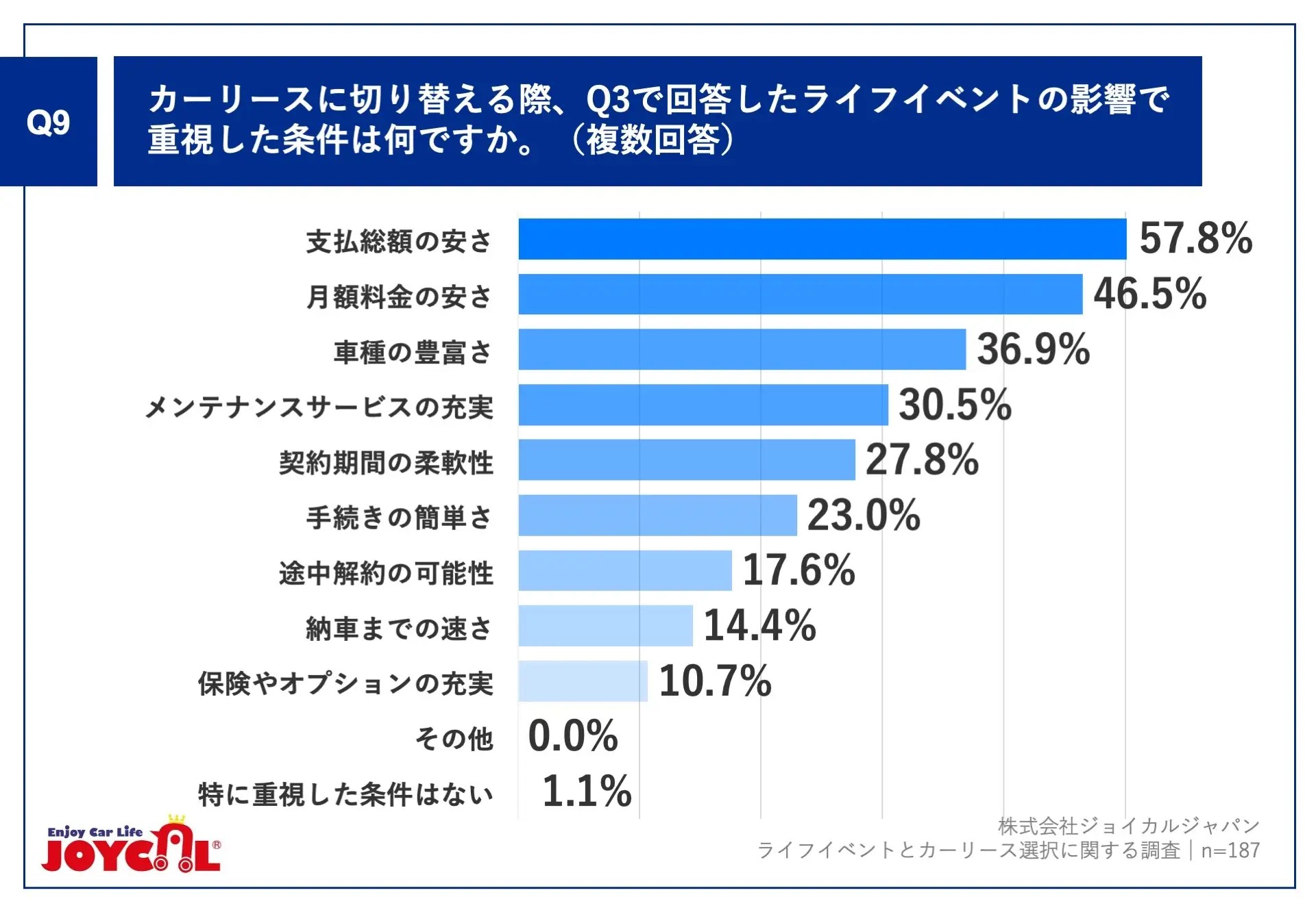 Q4で「わからない/答えられない」以外を回答した方に、「Q9.カーリースに切り替える際、Q3で回答したライフイベントの影響で重視した条件は何ですか。(複数回答)」(n=187)と質問したところ、「支払総額の安さ」が57.8%、「月額料金の安さ」が46.5%という回答となりました。