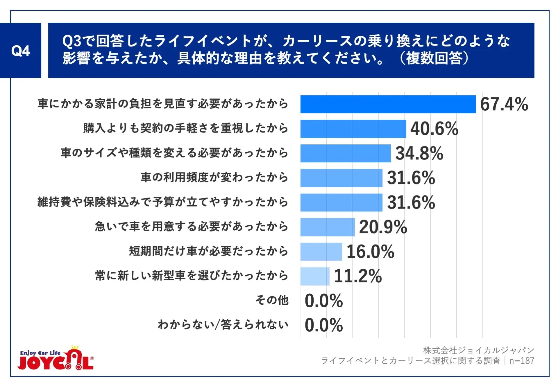Q3で「特になかった」以外を回答した方に、「Q4.Q3で回答したライフイベントが、カーリースの乗り換えにどのような影響を与えたか、具体的な理由を教えてください。(複数回答)」(n=187)と質問したところ、「車にかかる家計の負担を見直す必要があったから」が67.4%、「購入よりも契約の手軽さを重視したから」が40.6%、「車のサイズや種類を変える必要があったから」が34.8%という回答となりました。