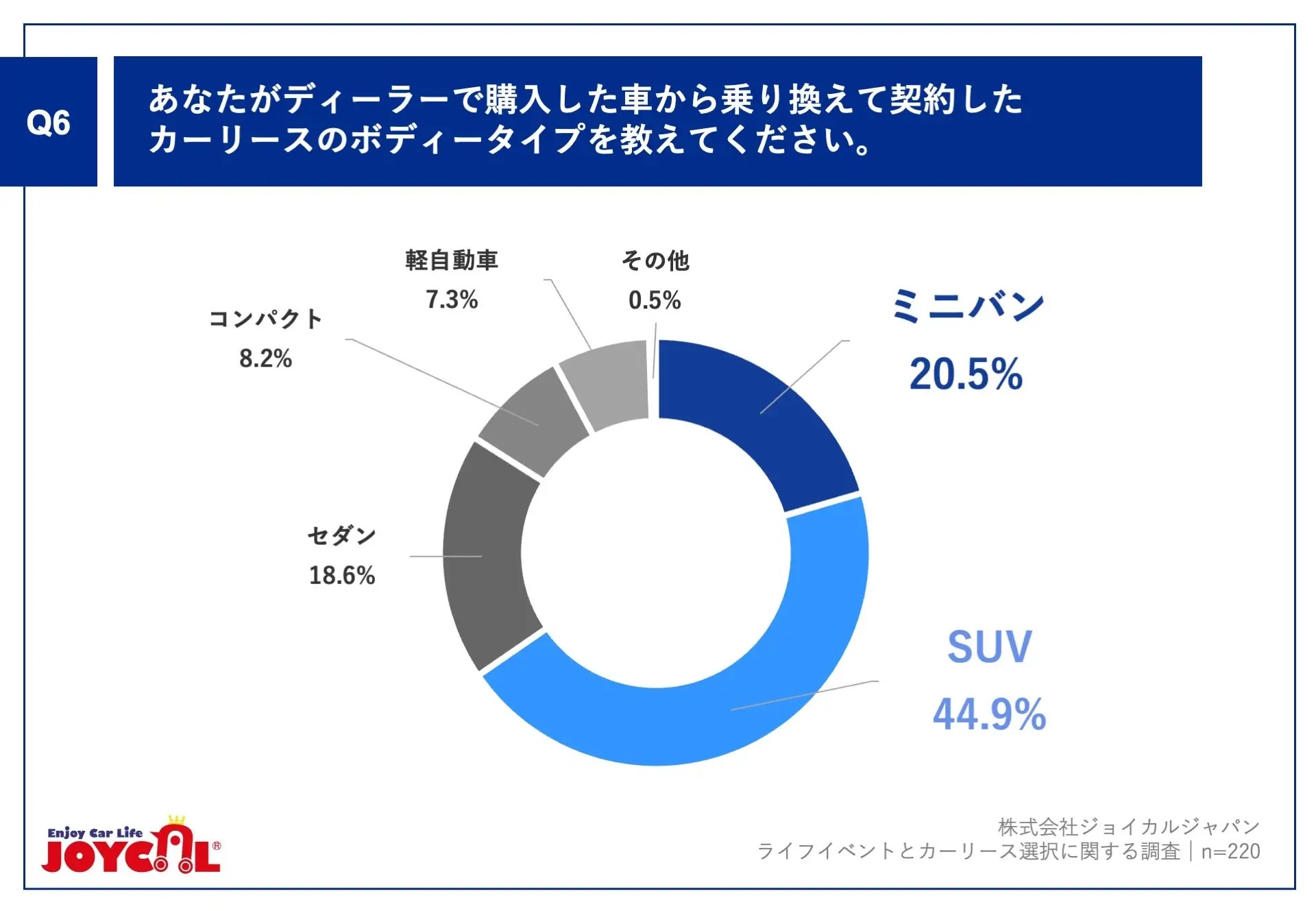 「Q6.あなたがディーラーで購入した車から乗り換えて契約したカーリースのボディータイプを教えてください。」(n=220)と質問したところ、「ミニバン」が20.5%、「SUV」が44.9%という回答となりました。