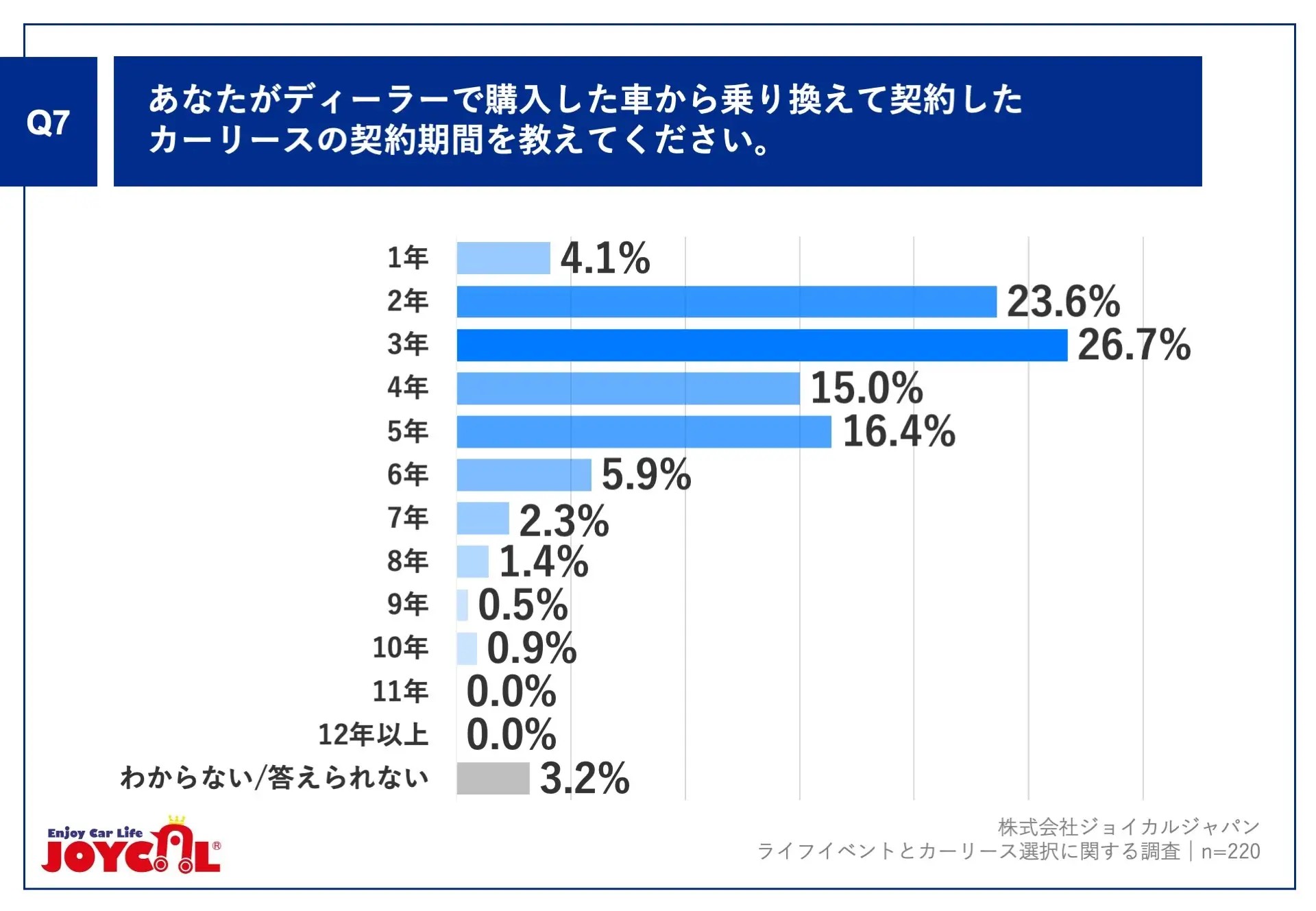「Q7.あなたがディーラーで購入した車から乗り換えて契約したカーリースの契約期間を教えてください。」(n=220)と質問したところ、「3年」が26.7%、「2年」が23.6%という回答となりました。