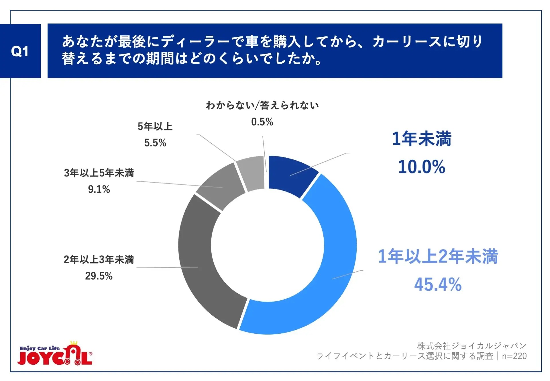 「Q1.あなたが最後にディーラーで車を購入してから、カーリースに切り替えるまでの期間はどのくらいでしたか。」(n=220)と質問したところ、「1年未満」が10.0%、「1年以上2年未満」が45.4%という回答となりました。