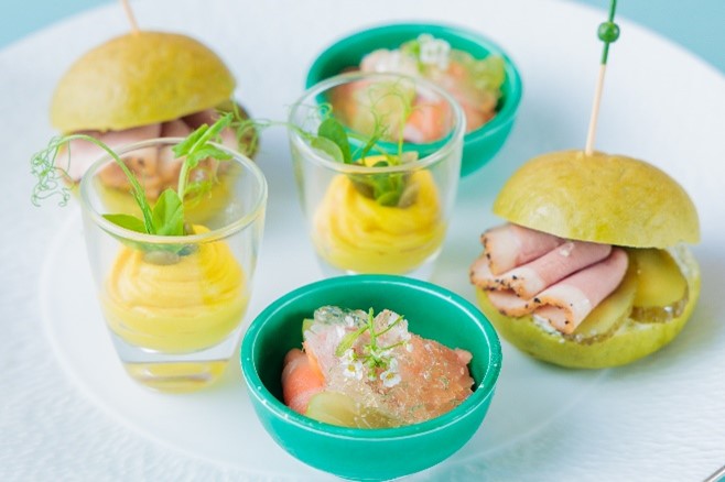 アフタヌーンティーの3段スタンドを彩るのは、チーズタルトやエクレア、ショートケーキやムースといった定番スイーツと旬を迎えるシャインマスカットを組み合わせたスイーツ4種。シャインマスカットをたっぷりと使用しているのはもちろん、それぞれのスイーツと相性の良いフラワーやハーブを添えることで、この時期だけの特別な味わいに生まれ変わります。