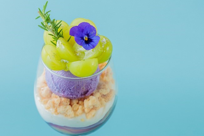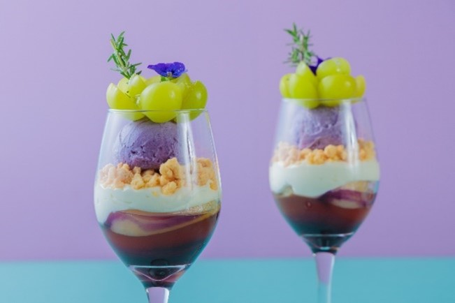 黄緑と紫の組み合わせが美しい印象的なシャインマスカットとブドウのパフェは贅沢にもおひとりさまお一つずつご提供。ブルーベリーカシスコンポートやホワイトチョコレートクリームなどのベースに、爽やかな甘さの葡萄のシャーベットとシャインマスカットをたっぷりのせ、最後にエディブルフラワーとローズマリーの香りでアクセントを加えることで、ここでしか味わえないオリジナリティ溢れるパフェに仕上げました。