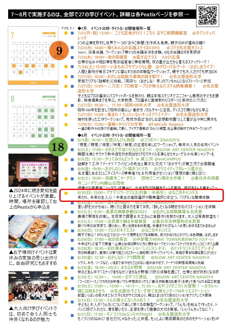 大好きな愛知の夏を面白く盛り上げよう!―そんな想いを持つ、業種も規模も異なる46社が肩を組み、各社自慢のヒトやモノ、 場所やアイデアを出し合ってつくる、おかしな学びイベント、それが「おかしなサマースクール in 愛知」です。知ってる会社の意外な一面が見えたり、初めて知る会社の面白さに気づいたりしちゃうかも。(おかしなサマースクールin愛知は名古屋市の後援事業です)