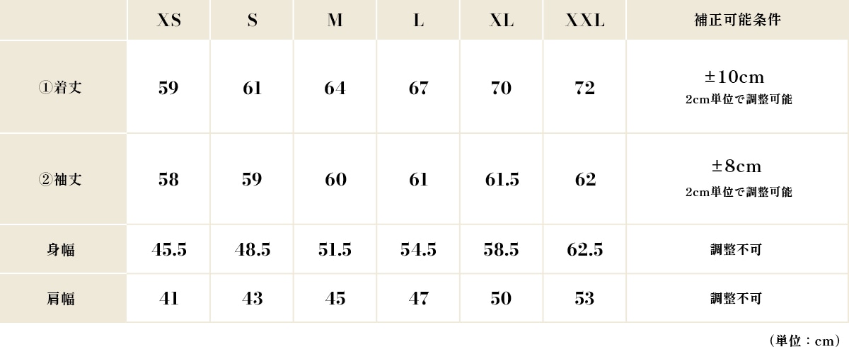 XS〜XXLのサイズを基準に、袖丈と着丈を自在にカスタマイズ可能。オーダーメイドならではのフィット感をお楽しみいただけます。
