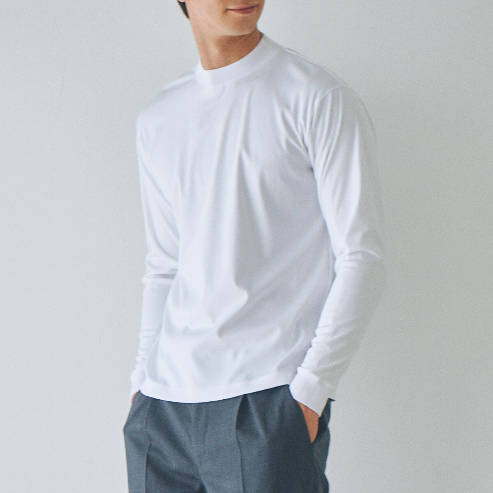 襟は前後のリブの高さを変えた変形モックネック。フロントのリブは一般的なモックネックよりも若干低めにし、カジュアル感を軽減した上品なシルエットにしました。