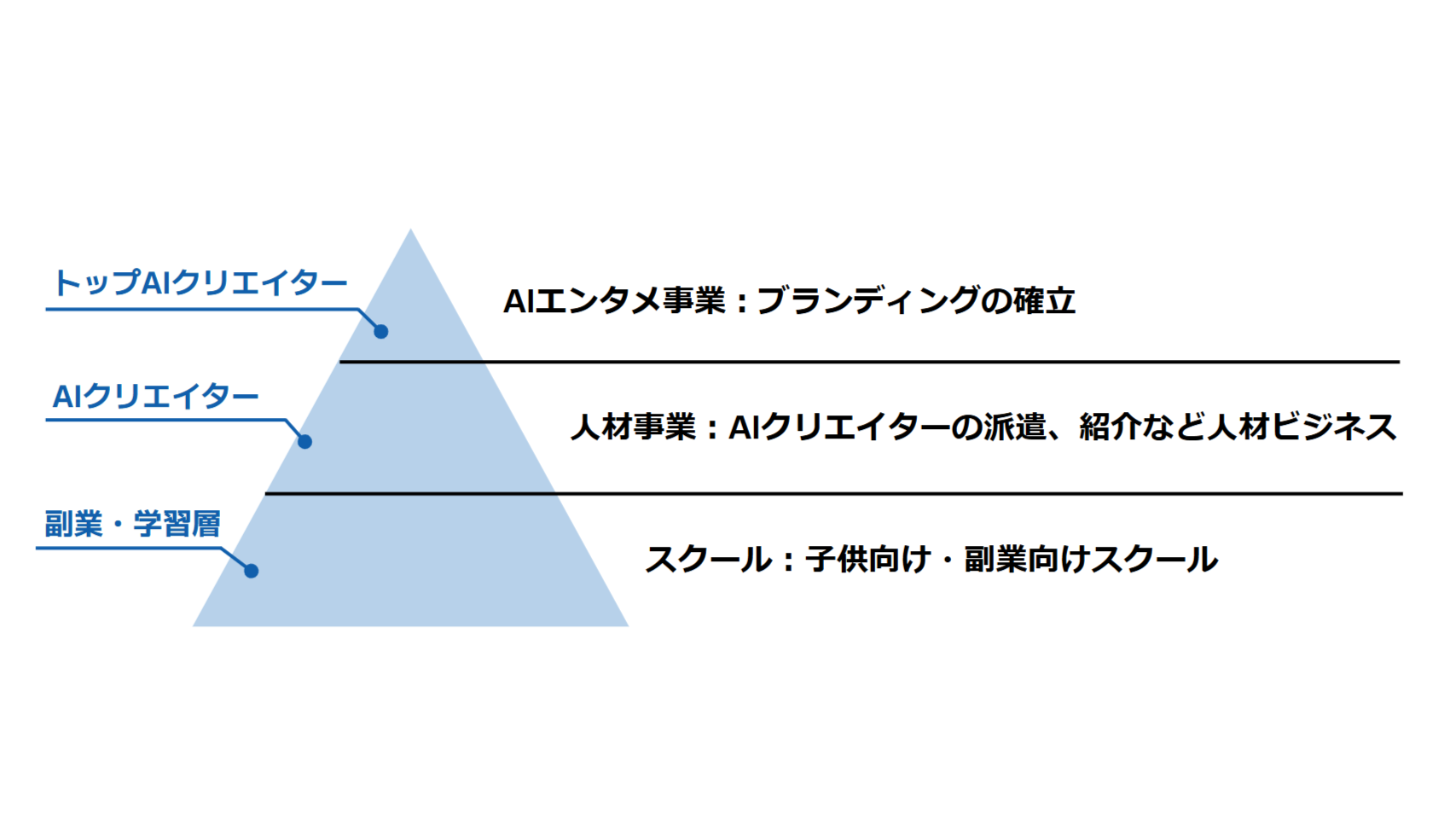AIクリエイターの活躍の場を広げる事業です。AIスキルを持つクリエイターの派遣や紹介、コンテンツの受託制作などを通じて、企業のAI活用ニーズに応え、クリエイターに安定した収益機会を提供します。